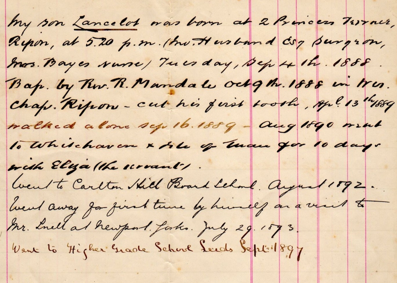 Notes written partly by Lancelot’s father, George Sercombe Daniels